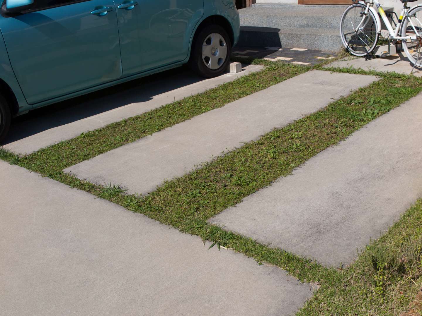 解決策として、アプローチの床材を駐車場のデザインと一体化させて空間を広く見せたり、飛び石のように配置した平板の上をタイヤが跨げるように設計したりする方法があります。