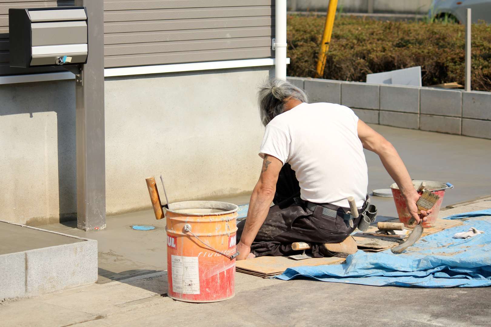 また、人工芝を敷いたり、レンガを使って小さな花壇を作り直したりといった作業も、楽しみながらコストダウンを図れる部分です。 しかし、これらはあくまで「車が乗らない場所」や「仮設的な舗装」に限られます。毎日数トンの重量がある車が乗り入れ、ハンドルを切る力が加わる駐車場の床面作りは、手作業では強度が足りず、すぐに凹んだり割れたりしてしまうリスクが高いのが現実です。