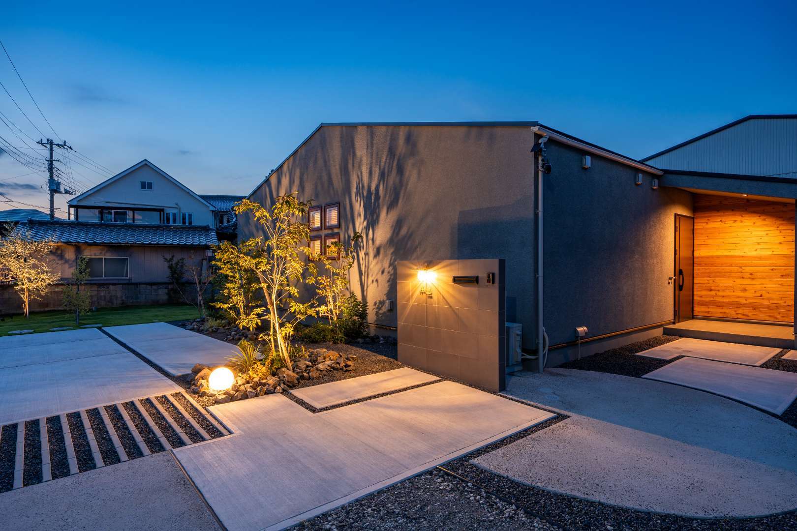 照明を取り入れることで、外構は “夜も楽しめる空間” に変わります。